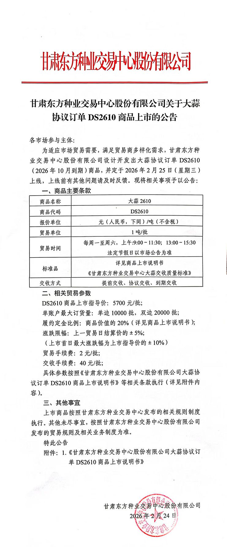 关于大蒜协议订单DS2610商品上市的公告