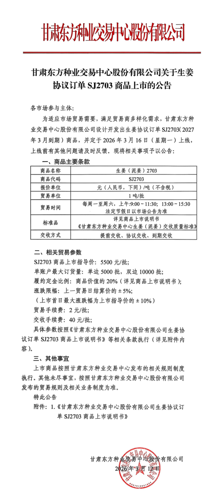 关于生姜协议订单SJ2703商品上市的公告