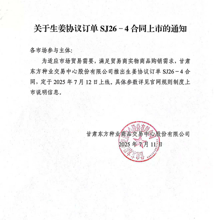 关于生姜协议订单SJ26-4合同上市的通知