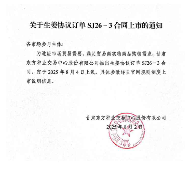 关于生姜协议订单SJ26-3合同上市的通知