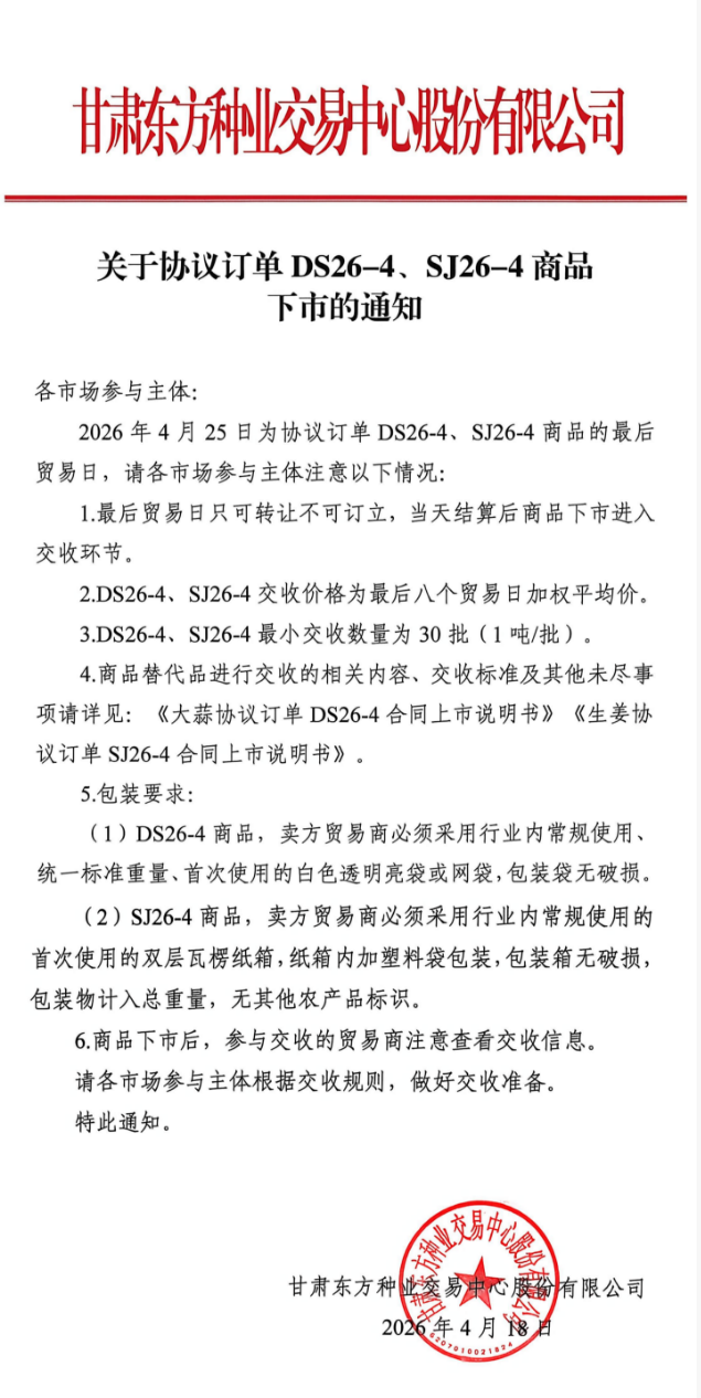 关于协议订单DS26-4、SJ26-4商品下市的通知