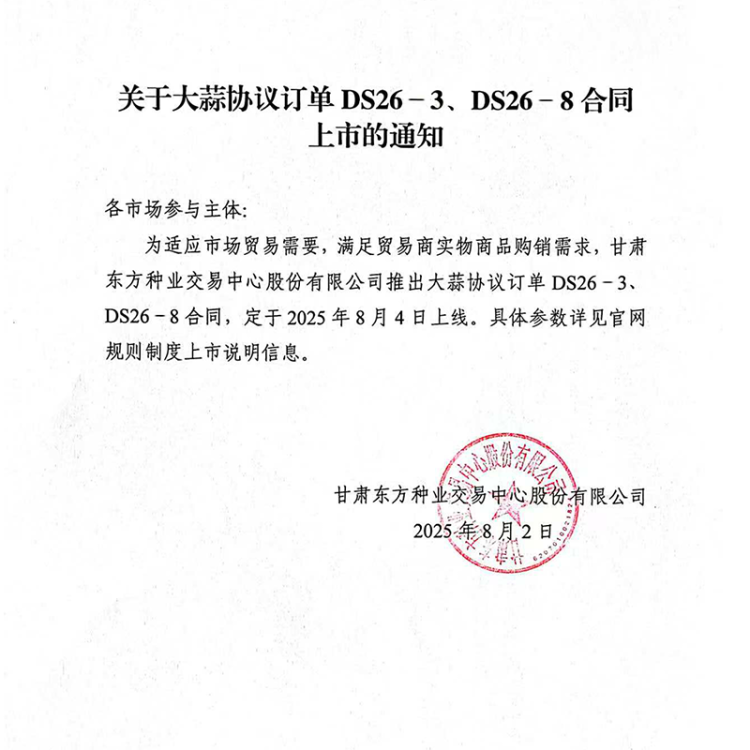 关于大蒜协议订单DS26-3、DS26-8合同上市的通知